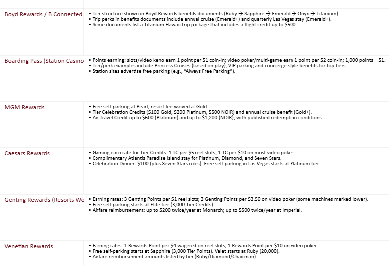 Stations is the best rewards program for a video poker player because it’s the most direct: defined VP earning, simple value conversion, and practical perks that don’t require you to be a whale to matter. Boyd is the best runner up if you want the most “lifestyle upside” from steady action. Resorts World is the best Strip compromise. Caesars and MGM are better if you want network reach or you’re already playing at a high level. Venetian is more of a luxury experience play than a VP maxi.
